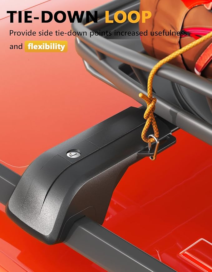 - 【Add Tie down loops】Tie down loops are added to each of the four brackets of the TUYOIUNG crossbar, which can accommodate ropes up to 1/4 inch (6 mm) wide. Tie down loops can play a huge role in securing items on your roof.
