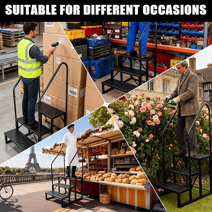 - 【Easy to Install Metal Steps】: Our rv stairs with landing come with instructions and all required accessories for easy assembly and use. Just install the panel first, and then install the handrail.Twist the every screw to make sure the porch steps is tight to use.