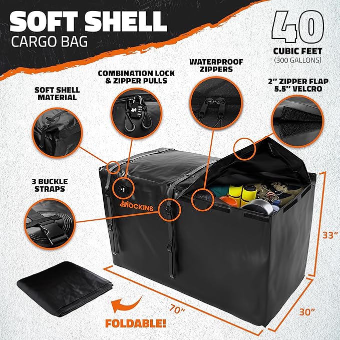 - WATERPROOF CAR HITCH & TRUCK BED CARGO BAG : With 40 cubic ft. of space, this 70"x30"x33" XXL tow hitch cargo carrier bag is built with full waterproof zippers for reliable cargo trailer hitch storage . Crafted from durable, abrasion-resistant vinyl, the Mockins Hitch Cargo Rack Bag stands up to tough weather conditions. It also features reinforced seams, a 2" protective flap, & 5.5" Velcro strips for excellent waterproofing, making this car hitch cargo carrier bag your ideal travel companion.
