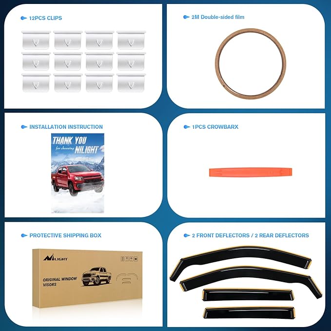 - QUICK AND EASY INSTALL: Nilight Wind Deflectors provides perfect fit for your Car. Just slip it onto your car’s window and your job is done within minutes. There is no drilling or no tools required.
