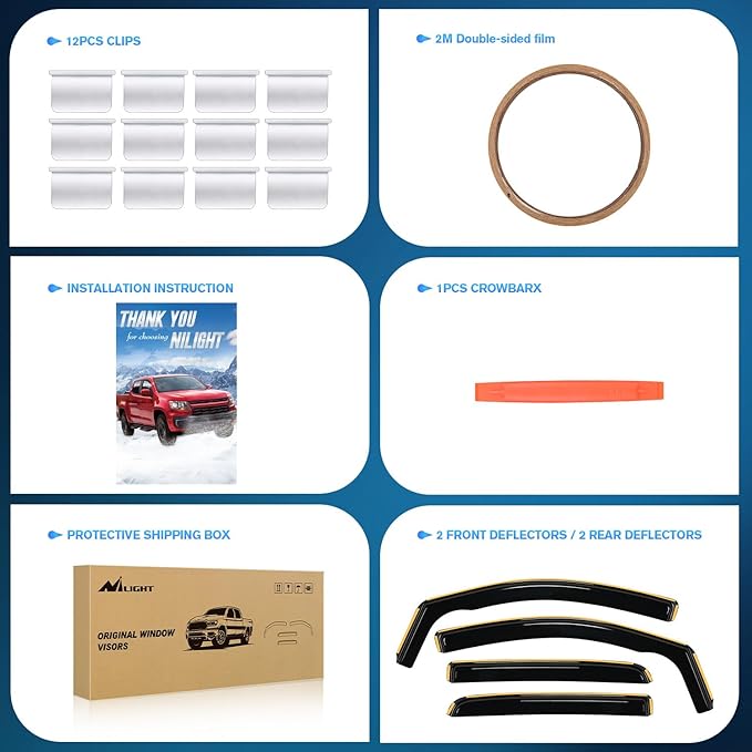 - QUICK AND EASY INSTALL: Nilight Wind Deflectors provides perfect fit for your Car. Just slip it onto your car’s window and your job is done within minutes. There is no drilling or no tools required. Be sure that window deflectors are water resistant, sun protective and will not bend, break or crack regardless of the weather conditions