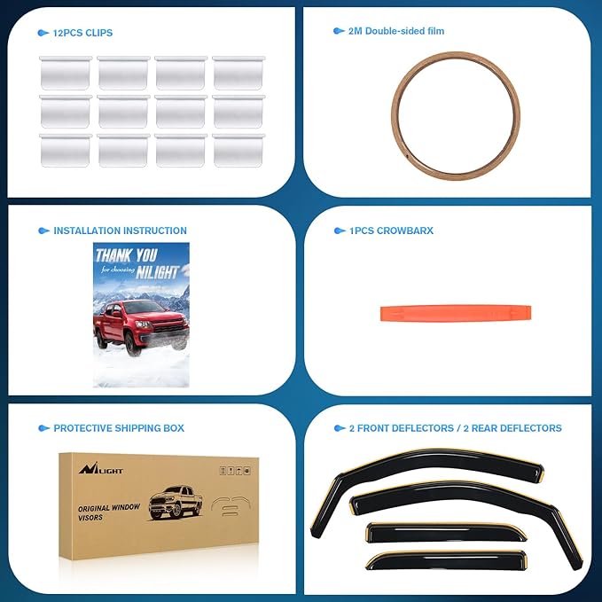 - IMPROVE DRIVING EXPERIENCE:Nilight window deflectors are great for all weather conditions,help improve ventilation inside and outside your car to reduce mirror and window fogging while increasing air circulation。With our side window deflectors, it deflects the rain and noise away from your windows to make your driving more enjoyable