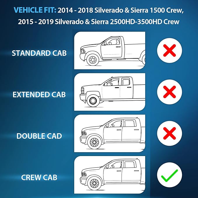 - FITMENT:2014 - 2018 Silverado/ GMC Sierra 1500 Crew Cab, 2015 - 2019 Silverado/ GMC Sierra 2500HD-3500HD Crew Cab
