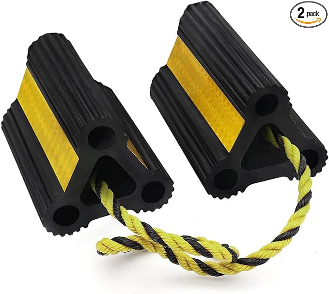- 【HEAVY DUTY】Crafted from sturdy rubber, these wheel chocks are built to last, offering slip resistance, weather resistance, and oil resistance. They are designed to withstand heavy use, making them significantly stronger than plastic chocks.