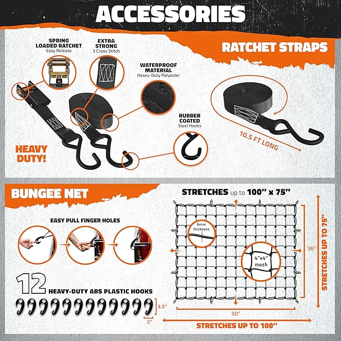 - ALL-IN-ONE ROOF RACK BASKET CARGO CARRIER : This car roof basket bundle comes complete with an extendable rooftop cargo rack , a large roof cargo bag , 3 sturdy buckle straps, 3 sets of ratchet straps, a cargo net, a combo lock & a convenient carry bag. Secure your gear to the roof cargo rack with heavy-duty adjustable straps, & use the elastic roof cargo net (50"x36") with ABS hooks to keep items in place. Plus, a reliable combo lock adds anti-theft protection for cargo racks for roof setups.