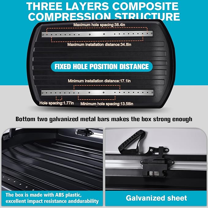 - 15.5 Cubic Feet Cargo Box with Car Trunk Organize,With the large capacity, the roof cargo box can help you securely carry 15.5 cubic feet worth of essentials, can increase vehicle cargo space without impeding on passenger comfort!