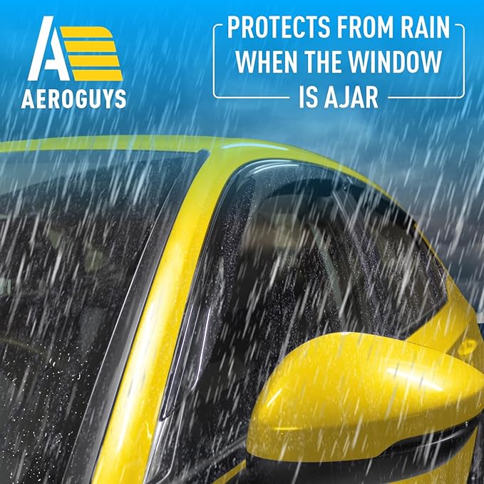 - No Tools Needed, Quick and Easy Assembly – These rain guards are very easy to fit. TAPE-ON INSTALLATION provides perfect fit for your car. Just slip it onto your car’s window and your job is done within minutes. There is no drilling or no tools required. Be sure that AEROGUYS window deflectors are water resistant, sun protective and will not bend, break or crack regardless of the weather conditions.