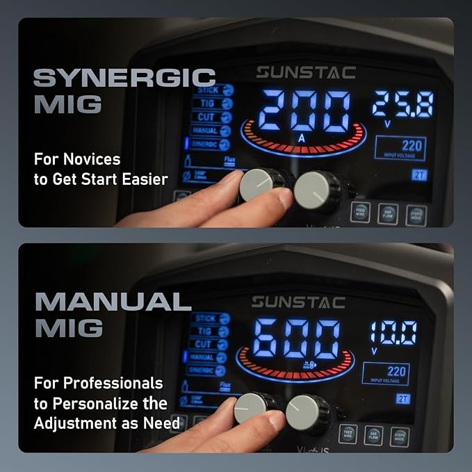 - 【5 IN 1 Multi-Functional】Looking for a welder and cutter combo machine? This will be your first choice. Sunstac 5 in 1 multi-functional welder and plasma cutting machine can do CUT / MIG / FLUX MIG / TIG / MMA. Beginner and Pro friendly, one machine does it all. One extra year warranty, covers all quality issues and missing parts