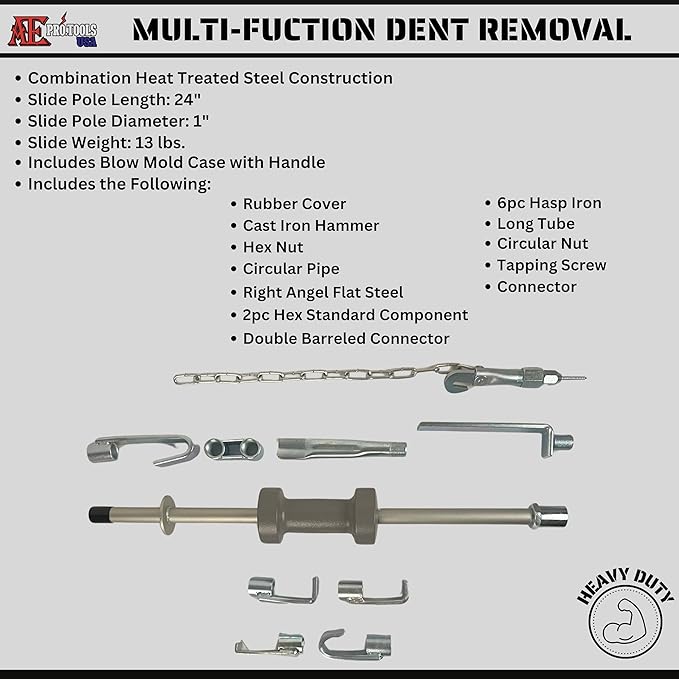 - {CONSTRUCTION} - Dent puller tools features a solid steel shaft with knurled handle for a sure grip on every project. Perfect size shaft gives you a powerful pull. Slide Hammer removes creases and bumps quickly with ease. With a 13LB Slide Force. Pole length is 24" with a 1" diameter. No need to remove vehicles panels or upholstery. Multi-pupose and universal construction can handle most dings and dents on your cars, trucks and more.