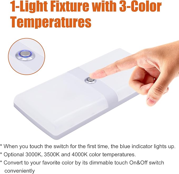 - Touch Dimmable Switch: Touch the switch 1st time to turn on the blue indicator light, touch the 2nd time to turn on the light fixture with 3 colors to choose from: 3000K warm white / 3500K bright white/ 4000K cool white. Hold on the switch to dim the brightness. No additional wall switch is needed. The LED RV light has a stepless dimming range of 10%-100%. You can easily adjust the brightness to suit your needs by touch the dimmer switch.