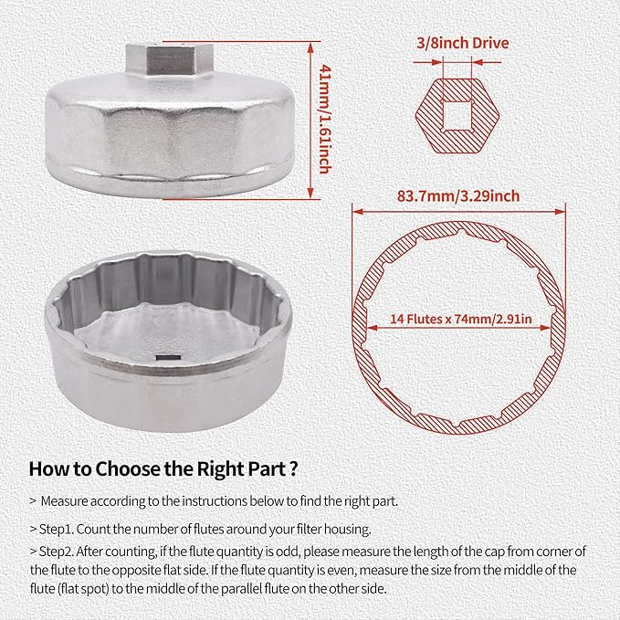 - [EASY TO INSTALL] - This 74 mm x 14 flutes Oil Filter Wrench Removal tool are easy to use, but if you don't have a similar experience, we recommend to ask support from the automotive specialist.