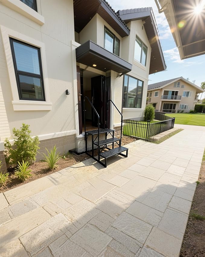 - 【Easy to Install and Clean】: The installation process for our step stool with handle is straightforward and usually does not require any special tools or equipment. The package of mobile home stairs includes the wrenches and screws needed for installation. The black polished surface of our outdoor steps is also relatively easy to clean