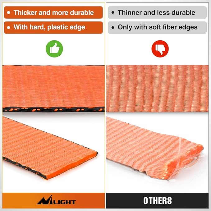- 【Premium Material】- Made of tight and heavy-duty polyester webbing, will not stretch over time or loosen with road vibrations.Constructed with stamped steel d-rings, Carbon steel D-rings are extremely hard and do not fracture easily when put under stress. The protective sleeve have the hard, plastic edge that protects the webbing from cuts and abrasion.