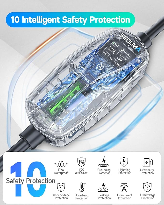 - SEGUMA Level 2 EV (32A, 240V, NEMA 14-50 Plug), Portable Electric Car with 25ft Extension, Adjustable Current, Home Outdoor Level 2 Mobile Electric Vehicle Station