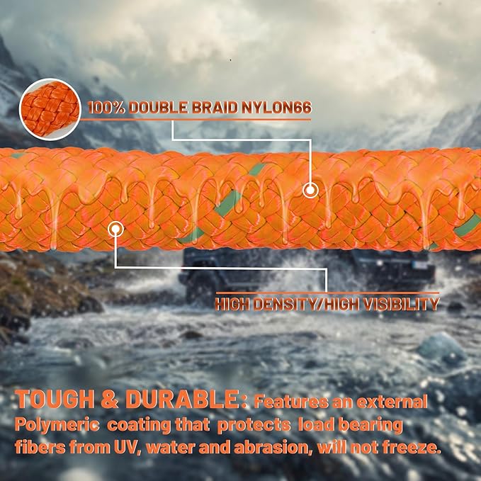 - QUALITY FIRST: No Compromises on Critical Recovery - We prioritize premium materials and meticulous craftsmanship over cost cutting. Crafted with double-braided Nylon66 and military-grade polymer coating, this kinetic rope delivers consistent, reliable performance for off-road emergencies
