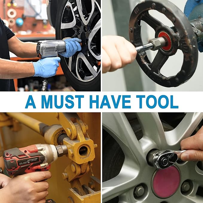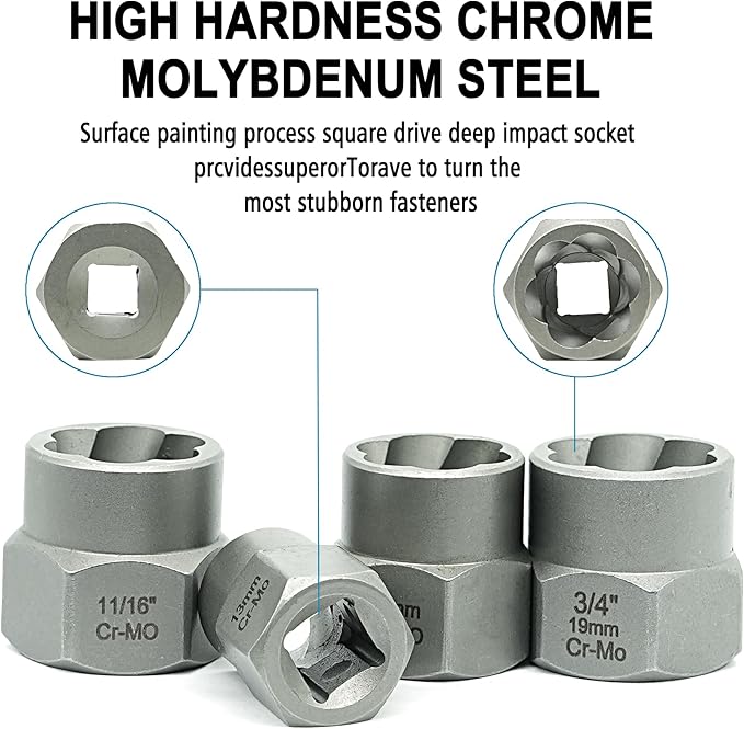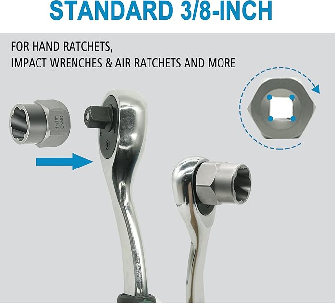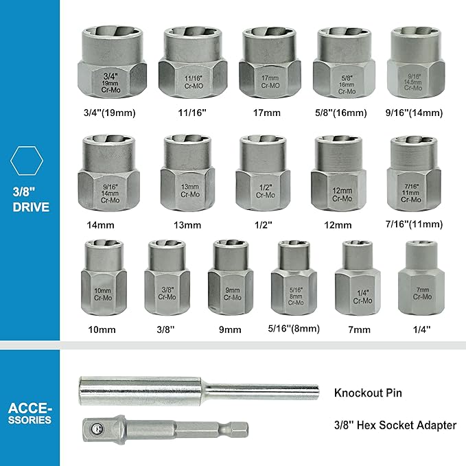 - Multiple Sizes: 18-piece 3/8 inch drive bolt & nut remover comes with 3/4"(19mm), 11/16", 17mm, 5/8"(16mm), 9/16", 14mm, 13mm, 1/2", 12mm, 7/16"(11mm), 10mm, 3/8", 9mm, 5/16"(8mm), 7mm, 1/4", and hex adapter, extractor bar.