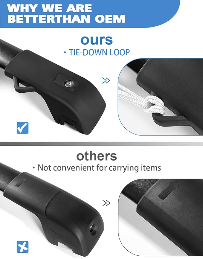 - 【Better Than OEM】Optimized re-designed crossbar by added metal mechanism lock system, this upgrade offers durable and 100% secure for anti-theft. Tie down loops on the base feet can help you secure items.Clampers are made from high grade plastic which add to extra security and durability.Max load capacity is 300lbs (130kg).