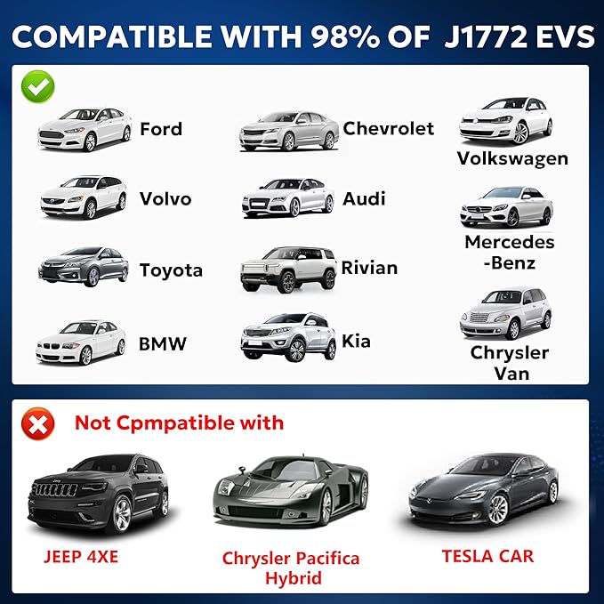 - 【Compatibility Notice】Note: Not compatible with Tesla Superchargers or Level 3 charging stations.The VIPTOO Adapter is designed specifically for BEVs and PHEVs, but please be aware that it is not suitable for certain models like Tesla, Jeep Wrangler 4XE, and Chrysler Pacifica Hybrid. This ensures you don’t face any unexpected challenges when trying to charge your vehicle. Always double-check your vehicle’s charging port type before purchasing to avoid any inconvenience