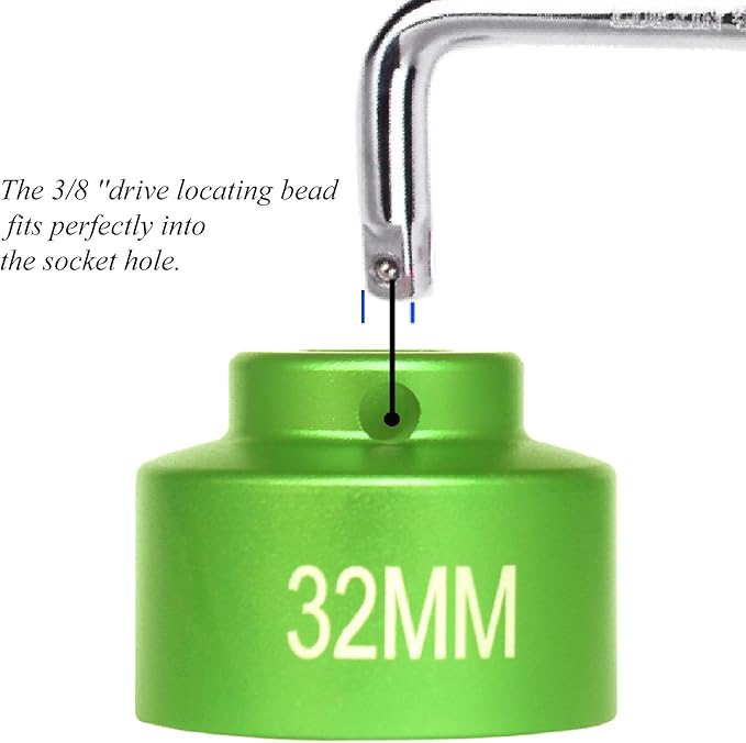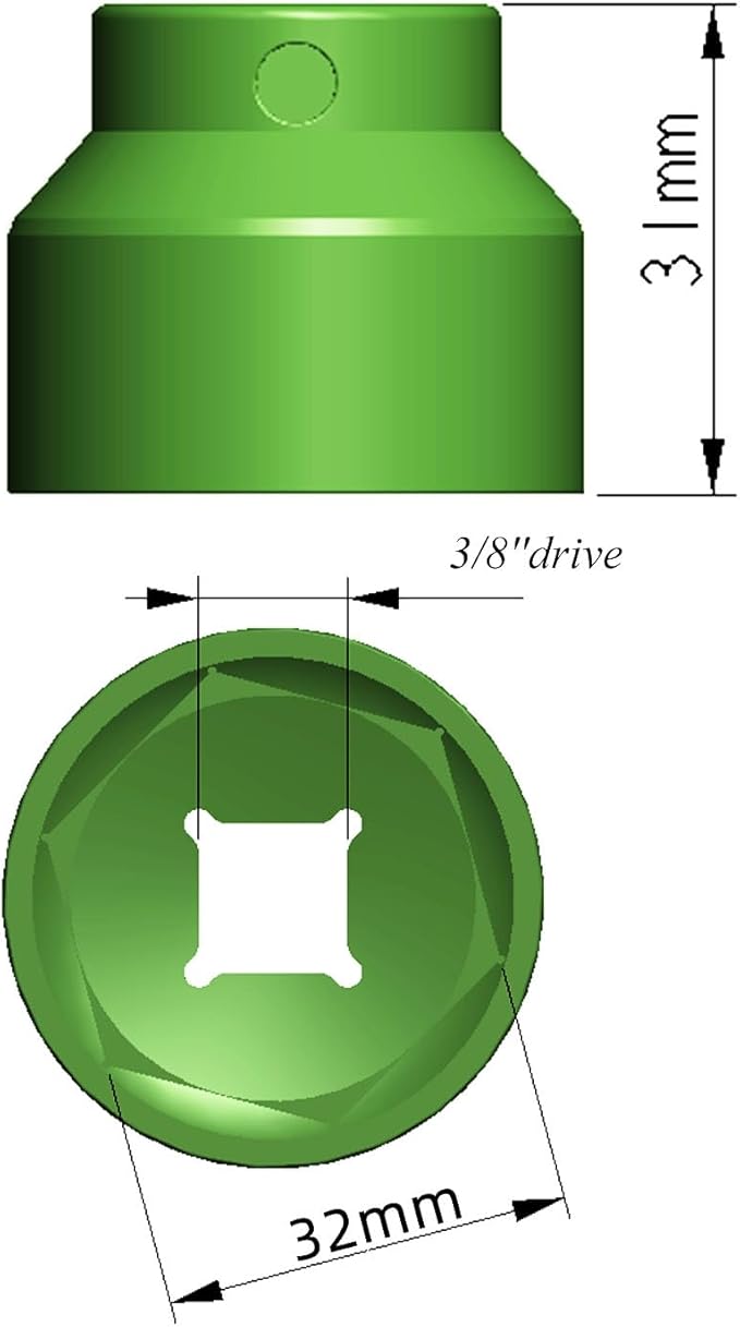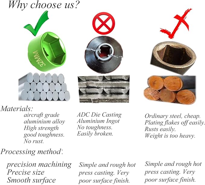 - 32mm socket use 6061 aerospace grade aluminium alloy material, precision CNC machined to exact dimensions to avoid corners on the socket. The 6 faces in contact with the filter are wide and fit well. The surface is sandblasted anodised, smooth and delicate. Light weight, high toughness, good strength. Never rust. it is not recommended for use on axle nuts and rusted steel nuts.Prohibited for use in electric/pneumatic tools
