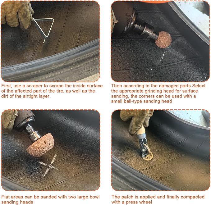 - 【Package Included】2 xTungsten Steel Buffing Wheel ;1 xTire Patch Rollers ; 1 x Tire Patch Scraping Cutter; 1 xLow-speed hexagonal connecting rod ; 1 xhigh-speed circular connecting rod