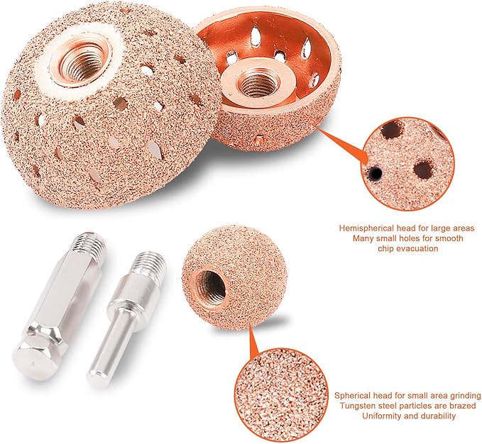 - 25mm Spherical head for small area grinding Tungsten steel particles are brazed for uniformity and durability . 42 mm 55mm Hemispherical head for large areas with many small holes for smooth chip evacuation.55mm Tungsten Steel Buffing Wheel can only be used in conjunction with high-speed circular connecting rod.