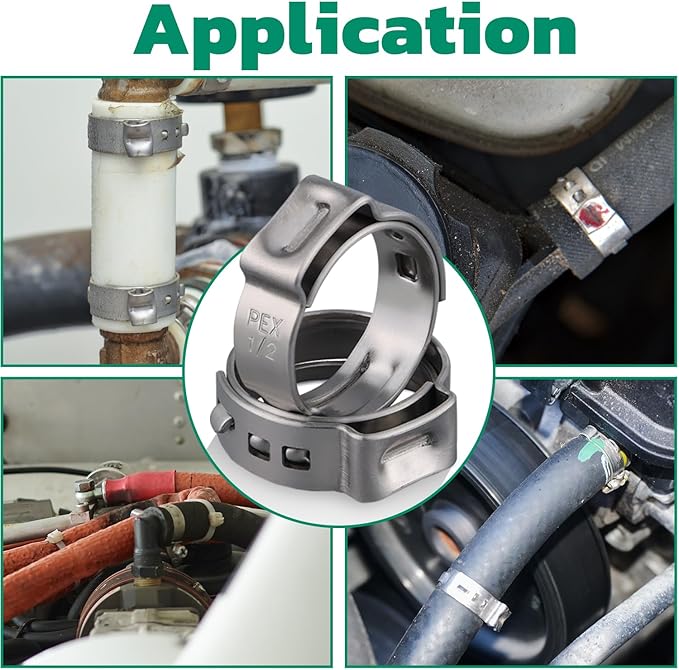 - Applications Introduction: The single ear hose clamps can be used for indoor and outdoor pipes, hoses, tube, oil pipes, pex tubings and any other plumbing system. Perfect for water supply system, water heater, air condition system, pipeline system, hydronic heating, electrical plumbing, automotive, industrial, marine etc.