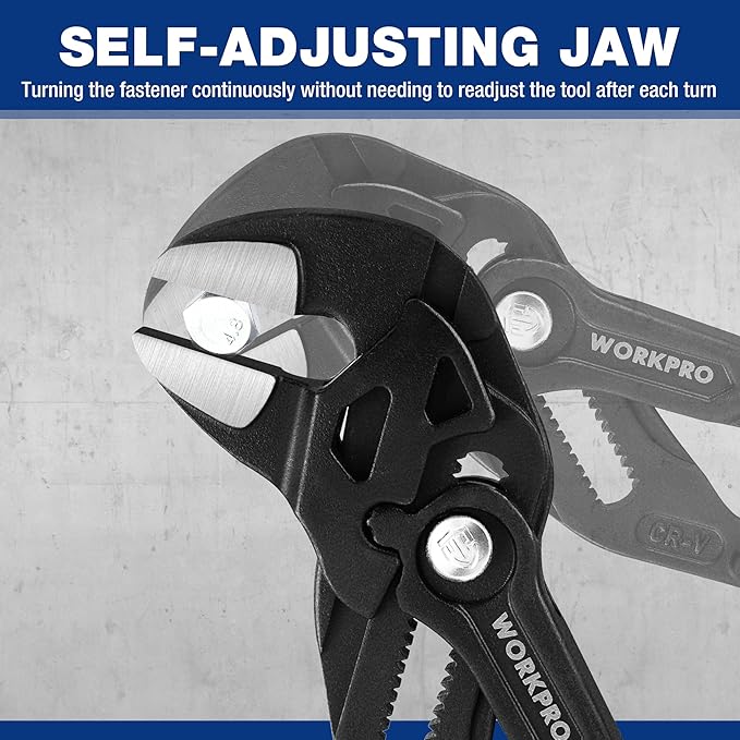 - Self-Adjusting Jaw: One of the standout features of the WORKPRO pliers wrench is its self-adjusting jaw, which allows for continuous rotation without the need for constant readjustment. This smooth and continuous operation significantly speeds up the task at hand, making it perfect for professionals who need to maximize productivity