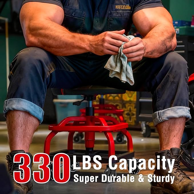- 【330 LBS Capacity】This heavy duty shop stool is specially designed with a thick angle steel frame, ensuring long-lasting performance and reliability. Its design can withstand heavy use, with an overall weight capacity of around 330 pounds. It is a sturdy and practical choice for use in garages ,workshops & any other heavy duty work places