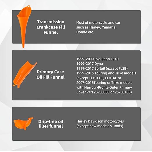 - Drip-Free Oil Filter Funnel: Compatible with Harley Sportster XL (2004-later), XR (2008-2013), Dyna (1999-2017), Touring (1999-2016), and Trike (2009-2016), Compatible with most new Harley-Davidson models (except V-bars).