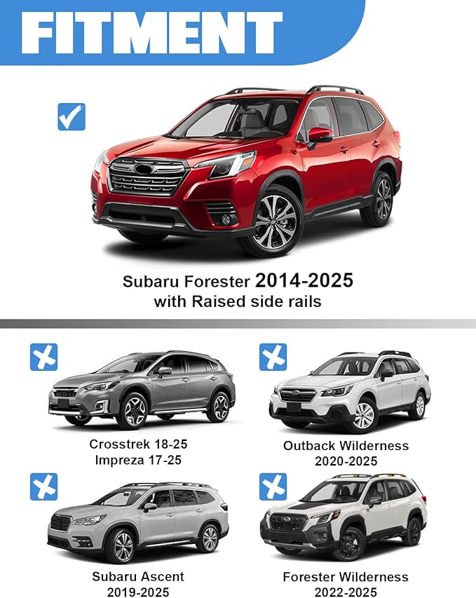- 【Compatibility Compatible with Subaru Forester 2014 2015 2016 2017 2018 2019 2020 2021 2022 2023 2024 2025 2026 with Raised Side Rails (Not for Wilderness). Not Compatible with 2025-2026 Subaru Forester Sport & Touring with Flush Side Rails.