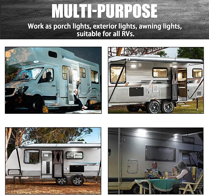 - 【Multi-purpose Application】 Work as 12 volt exterior rv lights, exterior lights, awning lights, suitable for all RVs, trailers, campers, caravan, motorhome, marine, cabinet and so on. The Led RV lights exterior is like the messenger of the sun to accompany you through the long dark night.