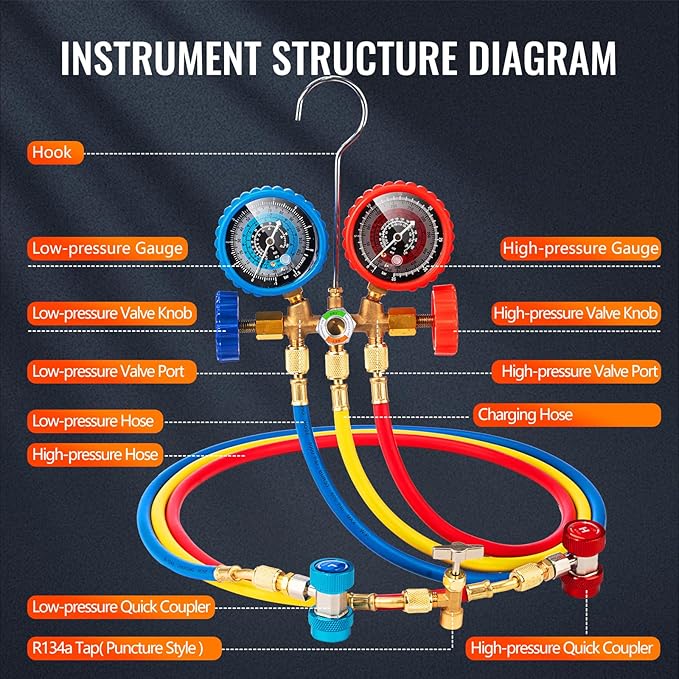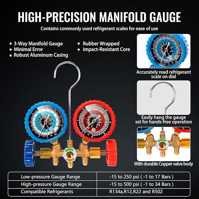 - Manifold Gauge Set: Professional dial provides direct readings of temperature(℉), pressure(psi), and refrigerant flow, enhancing diagnostic efficiency;with a top hook for easy hanging, freeing up hands for additional tasks