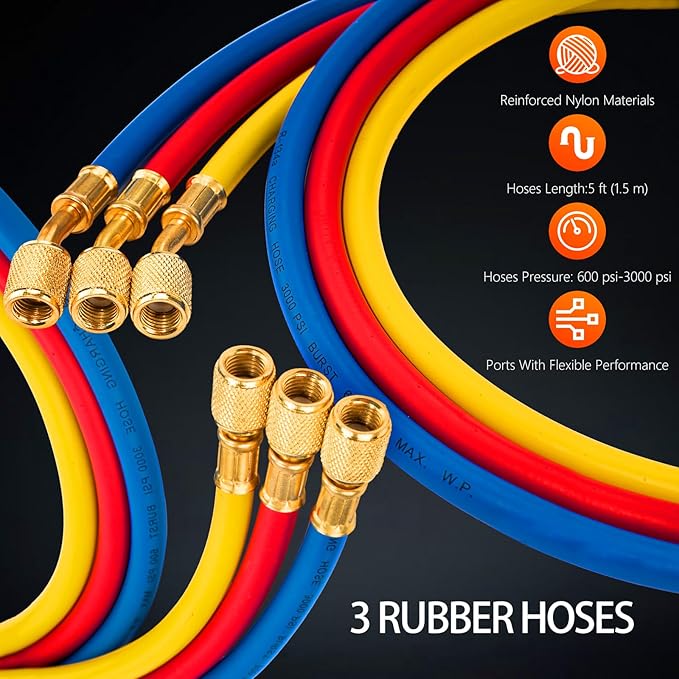 - Rubber Hoses:The three 5 feet long color-coded rubber hoses (red for high-pressure, blue for low-pressure, yellow for filling) are flexible and durable, designed to withstand long-term use with a working pressure of 600 psi and burst pressure of 3000 psi