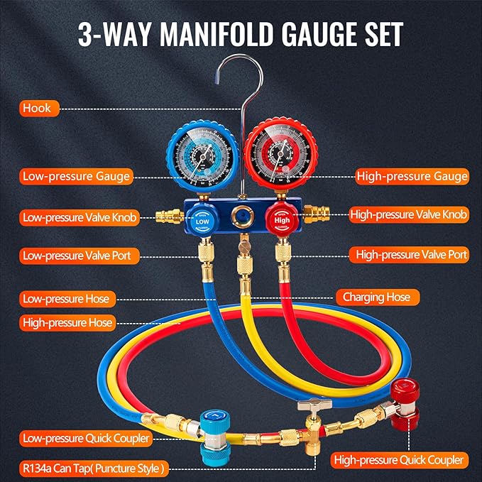 - Manifold Gauge Set: Professional dial provides direct readings of temperature(℉), pressure(psi), and refrigerant flow, enhancing diagnostic efficiency;with a top hook for easy hanging, freeing up hands for additional tasks