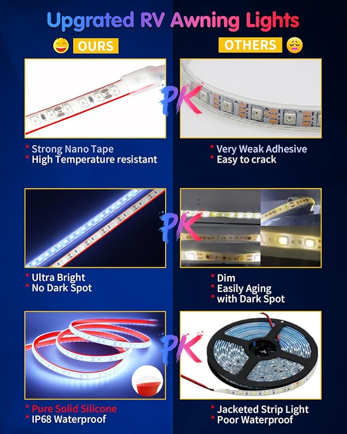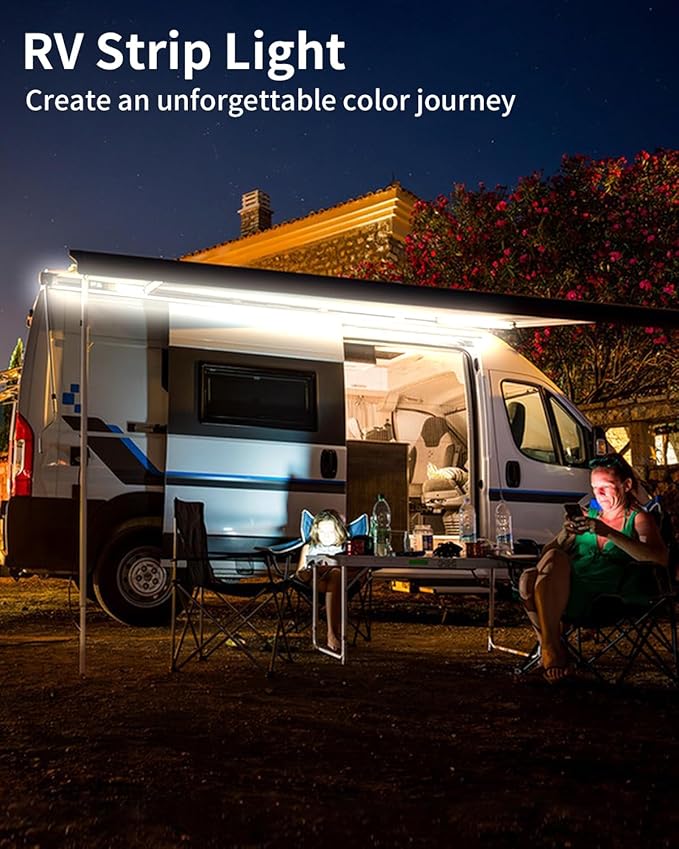 - 【Upgraded RV Awning Lights】:Our RV Led Strip light is made up with SMD 5050 LED chips, the 12v led light strip output of with Ultra brightness 3500Lumen.different than other normal ones,Upgraded silicone material, not easy to aging and yellowing.Great Add to Your RV Patio.
