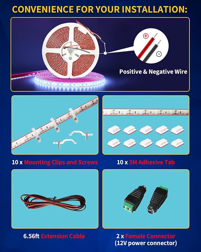 - 【Easy to Install】Our White led light strip is Flexible and Self-adhesive back with adhesive tape. it also comes with 10pcs led strip clips and screws, so you don't worry about the strip falling down after installation. Comes with a 2m 12V power cord, which connects directly to your porch light, light switch, or any 12V battery, the red wire is positive and the black wire is negative.