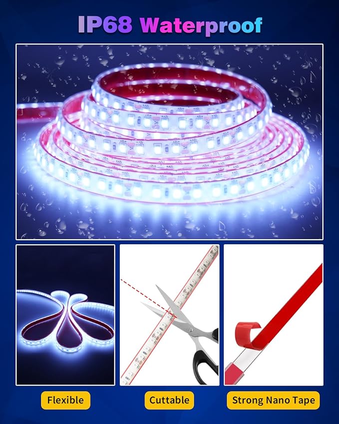 - Special Feature : IP68 Waterproof, Cuttable ,Flexible, Super bright, With Strong Nano Tape
