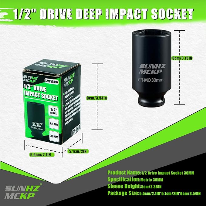 SUNHZMCKP 1/2" Drive Impact Socket, Metric 30 mm Deep 6 Point Socket, CR-MO, Axle Nut Impact Grade Socket for Easy Removal
