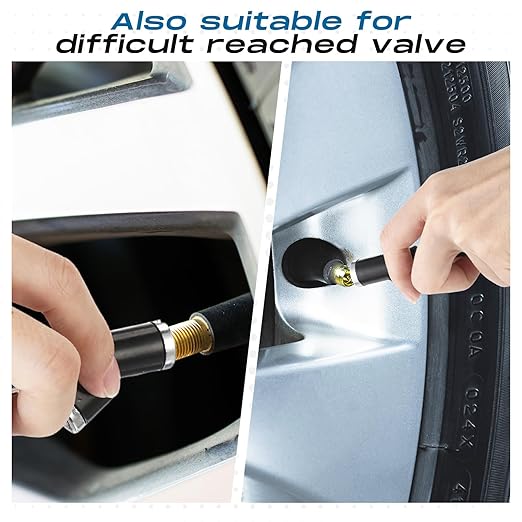 - Dual Head Chucks Design: air pressure tire gauge is equipped with two long zinc alloy head push pull chucks, suitable for inner wheels or difficult reached valve as well as the 30 degree reverse chuck for outer wheels; It has long stem which allow you to reach the inner wheels without dirty your hands