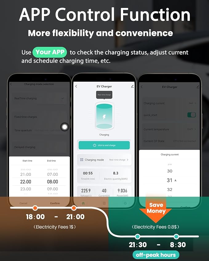 - Faster charging and lower bills, up to 9.6 kW at 240V, about 28 to 38 miles per hour depending on vehicle OBC and conditions, Schedule Charge shifts charging to off peak hours to reduce cost, Fixed Charge sets a daily start time automatically, works with or without the app