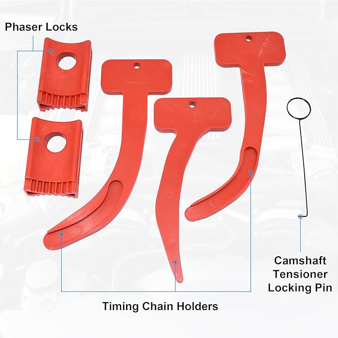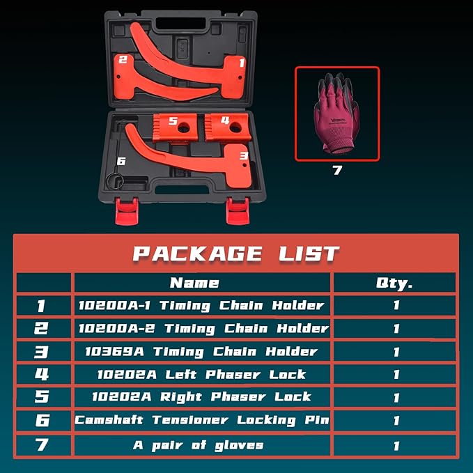 - Convenient to carry and operate: Camshaft Phaser Timing Chain Tool kit comes with 1 x Camshaft Tensioner Locking Pin, 3 x Timing Chain Holders, 1 x Phaser Locks, 1 x Portable Case, 1 pair x Gloves