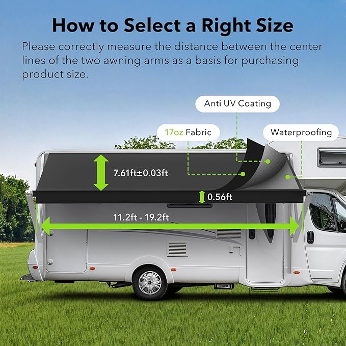- SELECT THE PERFECT SIZE: For the best fit, measure the distance from the center of the left support arm to the center of the right support arm on your RV roller before selecting your awning fabric size.