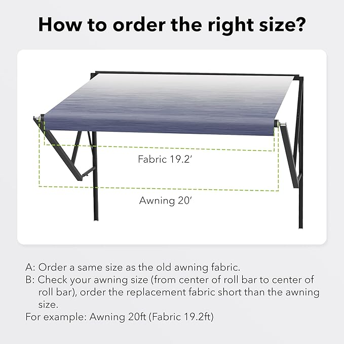 - SELECT THE PERFECT SIZE: For the best fit, measure the distance from the center of the left support arm to the center of the right support arm on your RV roller before selecting your awning fabric size.