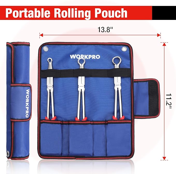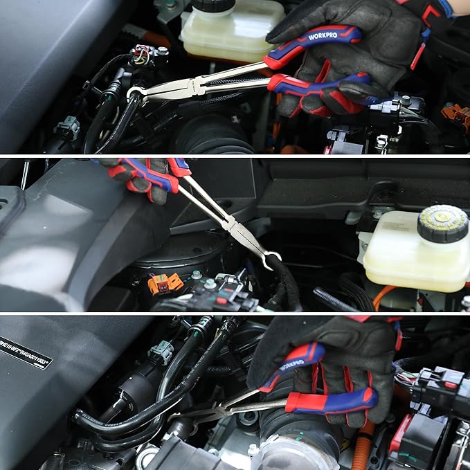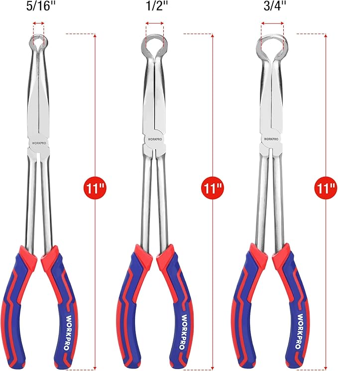 WORKPRO 3 PCS 11" Hose Gripper Plier Set, Long Reach Hose Gripping Pliers, 5/16-Inch, 1/2-Inch, 3/4-Inch Dia, Spark Plug Boot Removal Pliers, Serrated Jaws for Hard to Reach Narrow Spaces