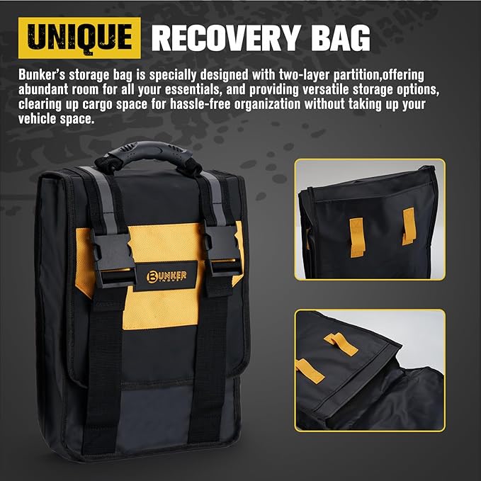 - Enhanced Safety: Bunker Indust’s signature yellow-black design delivers a striking appearance and boosts both protection and safety. The bright color and reflective strips on the tool bag enhance visibility during recovery operations, minimizing the risk of accidents and ensuring you remain visible in any condition