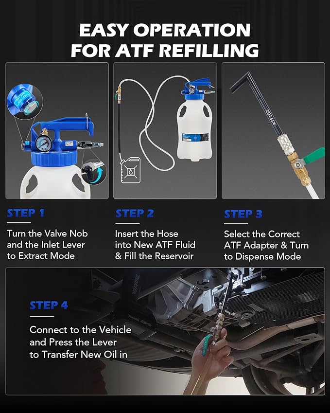 - Quality Construction: Three rigid polyurethane and nylon hoses, polyethylene reservoir, and 6061 aluminum alloy adapters are all highly resistant to heat and chemical corrosion to easily handle even the grimiest old fluids year after year