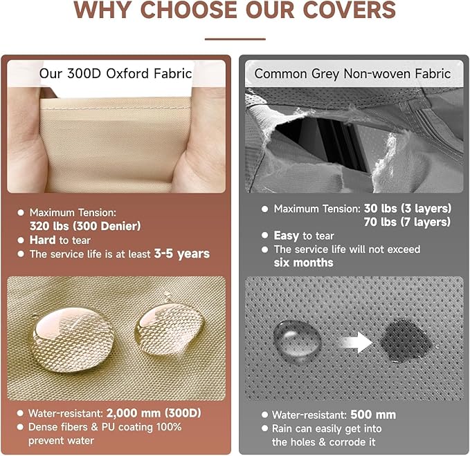 - ✔【Oxford Fabric vs Non-Woven Fabric】Unlike ordinary non-woven fabric RV covers, Vinpatio brand chooses the superior quality heavy-duty 600D Oxford fabric as the material. In comparison, our 600D Oxford fabric offers a maximum tension of 320 pounds, surpassing the 70 pounds of 7-layer non-woven fabric. With our Oxford fabric RV cover, you'll experience superior tension and tear resistance.Our Oxford fabric RV cover has a lifespan at least 2-4 times longer than non-woven fabric covers.