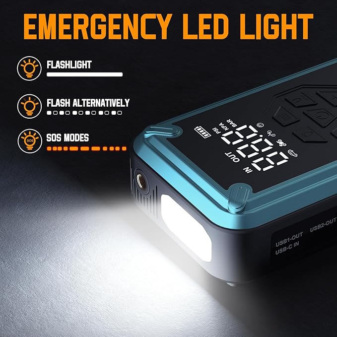- All-In-One Jump Starter: W160 integrates a variety of practical functions to meet all your needs, including car battery jump starter, air compressor, 300 lumen LED light last for 48 hours, SOS for emergency and portable power bank for various electronic devices
