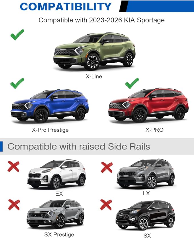 - 【Compatibility】Compatible with 2023 2024 2025 2026 Kia Sportage X-Line AWD, Sportage X-Pro, and Sportage X-Pro Prestige trims with Raised Side Rails. Note:Not Compatible with Kia Sportage EX/LX/SX/SX Prestige 2023 2024.When using the product, the skylight cannot be opened smoothly (Not for panoramic sunroof)! Please consider carefully before buying.