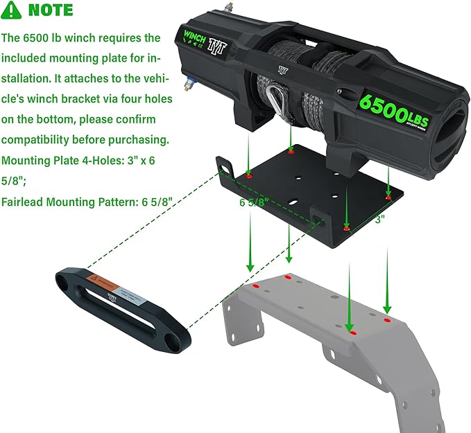 - 【Easy to install】6500lb UTV winch body size: 16''*4.5''*3.5''; Fairlead Mounting Pattern: 6 5/8 (169mm); Mounting Plate 4 Hole: 3"x 6 5/8" (76mm x 169mm). Standard body size and installation size allow the TYT electric winch to adapt to most mounting brackets. Universally fits YXZ1000R, Maverick X3, Maverick Trail, Commander, Pioneer series, Mule series, Teryx KRX 1000, Gator series, Wildcat series and other models of UTV.